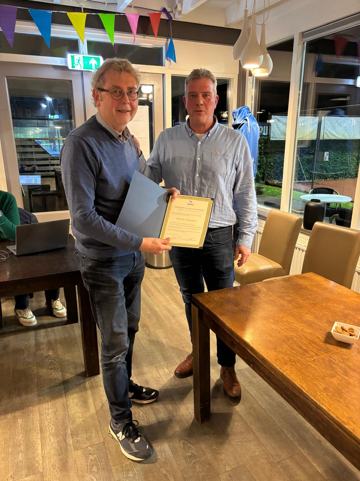 Tijdens de recente ALV op 29 oktober 2025 hebben we als vereniging met groot plezier Kees Thomasson erelid mogen maken. Kees is bijna vanaf de start van Ten Woude lid geweest en heeft zich zeer verdienstelijk gemaakt als Verenigings Competitieleider, toernooiorganisaties, beheerder afhangbord en lange tijd ook nog parkwacht.