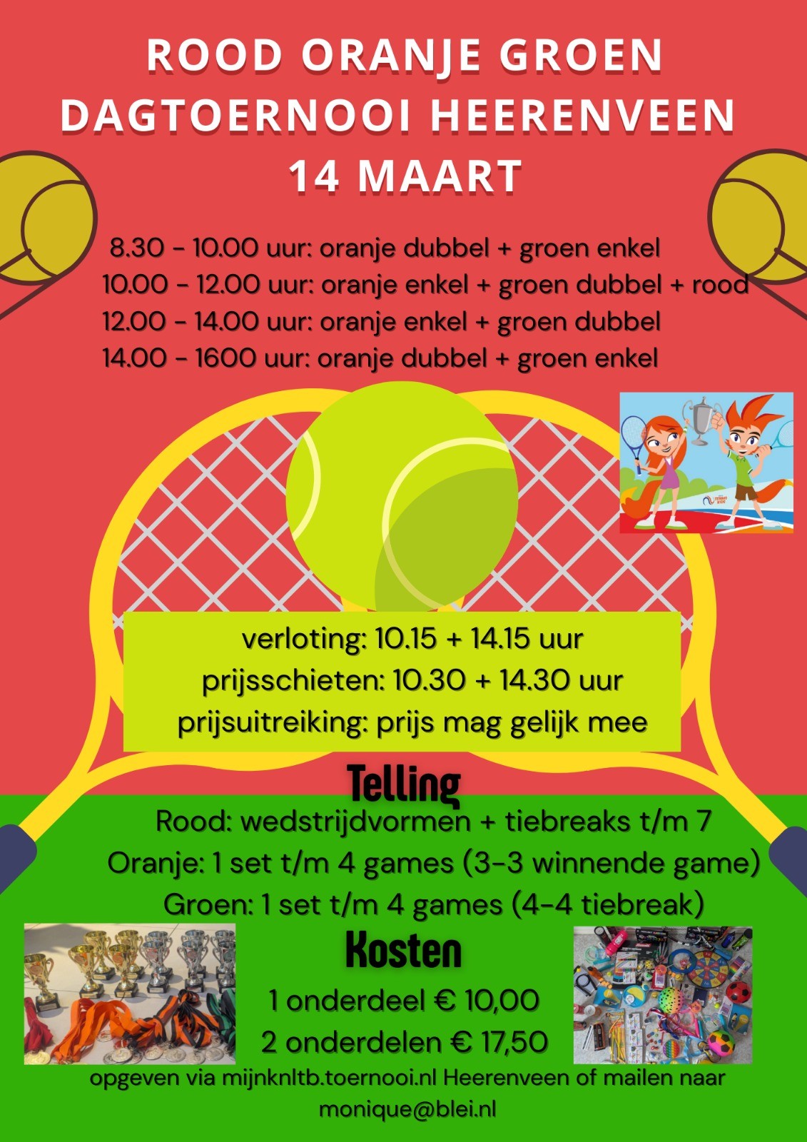 Gezellig dagtoernooitje enkel & dubbel voor onze Rood, Oranje & Groen tenniskids! Met verloting & prijsschieten!